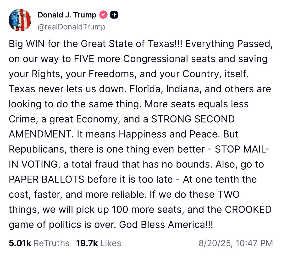 Donald Trump also called for other Republican states to redistrict, which is likely to force Democratic states like California and New York to redraw their maps in retaliation.